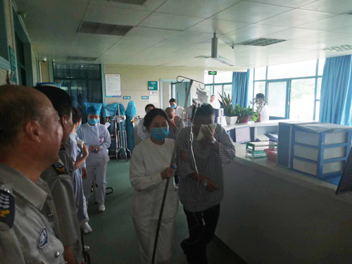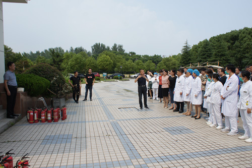 本次演习是模拟住院病区发生火灾后,进行报警、火灾扑救和火场疏散病员等各种情况的演习。下午15时, 值班的护士长发现着火信号,立即拨打保卫科电话,并指引病人和员工用湿毛巾捂口鼻迅速逃离火场,现场救援组集结人员组织行动不便的重症患者撤离火灾现场。演练结束后,保卫科进行现场讲解、示范、指导,详细告知所有培训人员在灭火时注意事项和使用干粉灭火器的方法要领,接着大家手拿灭火器,根据培训要领,一丝不苟地完成了灭火器灭火的操作全过程。