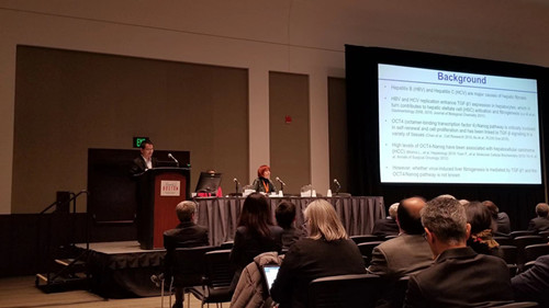 11月8日至12日,全球肝病学界规模最大、影响力最广的美国肝病学会(AASLD)第60届年会在美国波士顿举行,100多个国家(地区)的10000多名肝病学专家、学者以及医疗专业人士共襄盛会。我院感染科三病区副主任医师李文庭博士受邀在11月11日的大会上进行口头报告,报告题目为《HBV and HCV infection promote liver fibrogenesis through the TGF-β1 induced OCT4/Nanog pathway》,主要探索了乙肝和丙肝肝纤维化的发病机制, 基础研究部分在美国麻省总医院完成: 1. 建立了新的HBV/HCV 体外培养模型; 2. 探索了新的致肝纤维化的信号通路。临床研究部分主要在我院完成,收集了在我院住院诊治的慢乙肝患者肝组织以及临床资料,进行验证。本研究的原始数据由麻省总医院肝病研究中心核对,确保真实性。