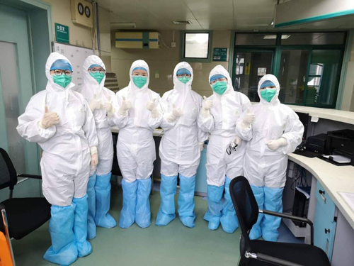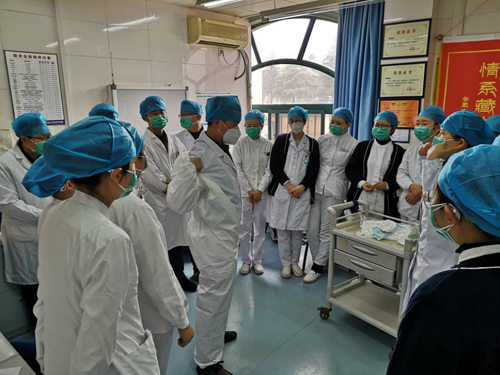 疫情重,时间短,任务急,有些同事甚至还没和家人交待清楚就冲上“救治前线”,打响守卫健康的保卫战。为了更好的救治患者,医务人员的安全防护也必须摆在首位,病区组织全科人员参加了院感科的防护培训,并由参加过禽流感疫情防治工作的高年资护士一对一带领低年资护士进入隔离病房,同时组织全员自学“新冠”肺炎相关知识,建立微信工作群,及时沟通,交流经验。进入隔离病房进入诊疗和护理时,采取双人合作,一人进入病房操作,一人在缓冲区监查配合,双人协作,在诊疗护理的同时保障医护人员不发生职业暴露。