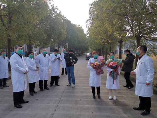 在我院隔离病区警戒线外,救治黄某的隔离病区主任徐静、护士长何霜霜向黄某献上鲜花和有病区全体医护人员签名的贺卡。