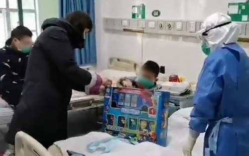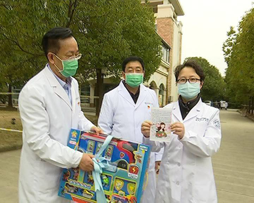 2月2日上午,院长张良明、副院长郑家华、院办公室主任张宇慰问了入住我院一家三口家庭新型冠状病毒感染肺炎患者,代表全院职工将玩具,画笔和零食交给四病区护士长王媛莉带进病房,并将慰问礼品及祝福卡片转交给小朋友。