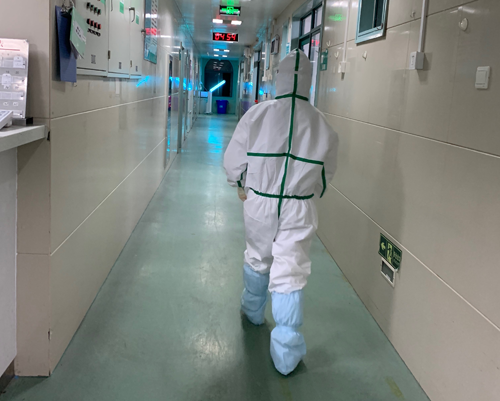 第一例患者入院时,五病区全部医护人员立即就位。时间紧张,有些同事甚至来不及和家人告别,就立即穿好防护服冲入“战场”,开始了紧张又繁重的救治、护理工作。在隔离病房里,全副武装的医护人员每次至少值守4小时以上,期间不能吃饭、喝水、上厕所。防护服,护目镜完全不透气,全是水气,口罩磨红了脸颊,汗水浸透了衣背,我们克服了对病魔的恐惧,对家人的思念,在不分昼夜的忙碌中度过了人生中最难忘的新春佳节。
