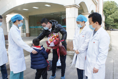 2月13日上午,4岁宝宝接过在隔离病房里经常陪他玩玩具的医生护士送来的鲜花。今天,他和他的爸爸就要从中国科大附一院(安徽省立医院)感染病院出院了,可以在家里玩玩具了。不过,小宝宝此时并不十分情愿出院,他不时回头看看自己住过的隔离病房,他的妈妈还留在那间隔离病房,今天不能和他们一起回家。