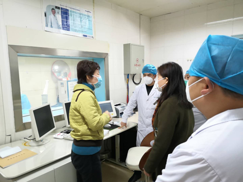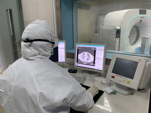 CT检查重要但对于传染病来说如何避免院内感染,尤其是疑似病例之间的交叉传染更重要,在院感科的指导下多次讨论优化病人检查流程,多人同时检查时病人候诊区的安排,在防护用品短缺的现状下制定出工作人员防护及机房、病人通道的消毒流程最优化的方案。移动DR主要用于危重病人的床边摄片,丁主任和王耀天医生主动承担起这项工作,从仪器的操作流程、消毒方法、数据上传等方面反复讨论,为临床会诊病情分析及时提供第一手影像资料。