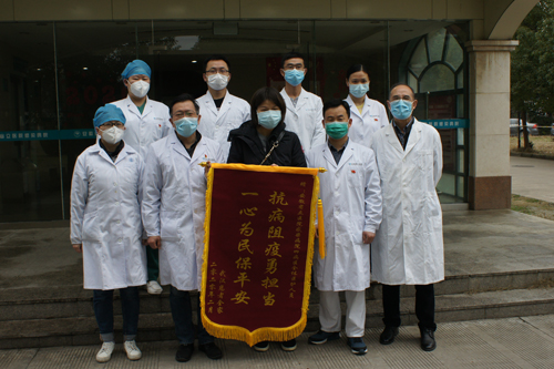 2月21日上午,武汉的新冠肺炎患者邓女士经我院四病区精心治疗,今天治愈出院,终于能与已在2月13日出院的爱人和儿子团聚了。走出四病区,她将一面绣着“抗病阻疫永担当,一心为民保平安”的锦旗和一封感谢信送到四病区主任朱孝武手中,不断向救治他们一家人的医护人员道谢,并邀请病区医护人员在新冠疫情结束后到武汉去玩。