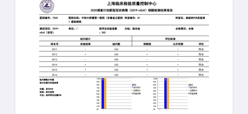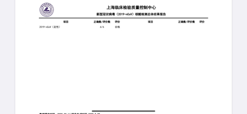 2月24日,感染病院检验科PCR室接收到上海市临检中心结果反馈,PCR室参与的新冠病毒(定性)测试的所有六个样本,检测结果全部符合评价标准,准确率为100%,顺利完成检测能力验证。