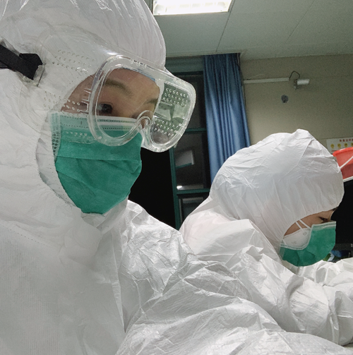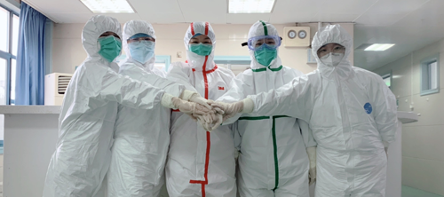 第一例患者入院时,五病区的护士小姐姐们立即就位。时间紧张,有些同事甚至来不及和家人告别,就立即穿好防护服冲入“战场”,开始了紧张又繁重的救治、护理工作。在隔离病房里,全副武装的天使们每次至少值守4小时以上,期间不能吃饭、喝水、上厕所。防护服,护目镜完全不透气,全是水气,口罩磨红了脸颊,汗水浸透了衣背,我们克服了对病魔的恐惧,对家人的思念,在不分昼夜的忙碌中度过了人生中最难忘的新春佳节。