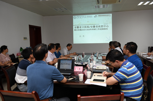 5月29日下午,中国科学技术大学附属第一医院(安徽省立医院)与安徽省疾病预防控制中心(安徽省公共卫生研究院)联合实验室在安徽省疾病预防控制中心南楼6楼会议室召开2019-2020年科研工作汇报会。中科大附一院(安徽省立医院)党委书记刘同柱、副院长翁建平、科研处副处长杨春梅、中科大科研部部长黄方,安徽省立医院感染病院院长张良明、科研副院长高勇、感染科主任李磊,安徽省疾病预防控制中心党委书记刘志荣、副主任黄发源及联合实验室科研团队有关人员等30余人参会,会议由安徽省疾病预防控制中心副主任苏斌主持。