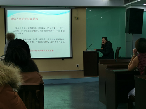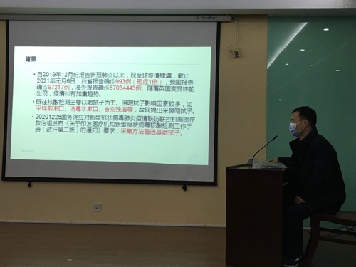 此次培训,由门诊部鹿伦山主任对鼻咽拭子采样技术及注意事项进行了详细的讲解,院感办武金凤主任对采样人员生物安全、个人防护要求、标本信息采集和管理、环境的清洁消毒以及职业暴露后的处理等内容进行了全面的培训。