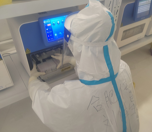 夜班时间是从夜里9点到第二天上午9点,由于正好赶上了上海市的第一轮新冠核酸大筛查,我们实验室第一天就需要完成7万管的检测量。时间紧,任务重,我又是第一次参与,丝毫不敢懈怠,但是由于对工作环境不熟悉,我还是收获了一次“教训”。晚上9点接替白班战友的工作后,我低估了夜里的实验室温度,虽然有层层防护衣加身,还是觉得凉飕飕的,尤其是到了凌晨,困意也伴随着寒冷一同袭来。当时我想,虽然很疲倦,自己也一定要坚持,毕竟我是代表医院来和大家一起战斗,何况自己还是一名党员,这时候更不能有任何的退缩!我一边鼓励自己,一边督促自己,在不断地加样、提取、点样中,时间过得很快。晨光微启的时候,我为自己能够顺利完成任务感到欣慰。