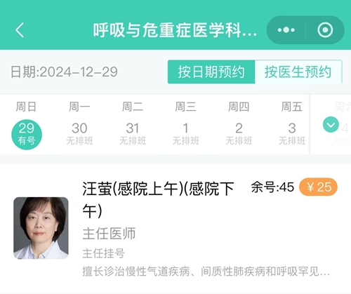 预约方式:关注“中科大附一院安徽省立医院”官方微信公众号或者支付宝生活号,点击“就医服务”,在“门诊挂号”栏中选择感染病院,搜索或选择“呼吸与危重症科学科门诊(感院)”,选择汪萤主任预约挂号。(可以提前7天进行预约挂号)