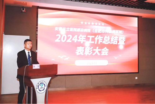 中科大附一院(安徽省立医院)党委委员、副院长郑昌成首先发表致辞,向一年来投身医院建设、履行岗位职责的全院干部职工表示崇高的敬意并致以诚挚的问候。他表示,2024年全院上下一心,医院的各项事业稳步有序推进,坚持党建引领、学科带动、人才强基、管理增效的发展路径。紧紧围绕集团“一院多区全网络”战略布局,持续提高人民群众的健康获得感。为高质量发展传染病专科医院打下了坚实的基础。新的一年希望感染病院(市传染病院)再接再厉,继续发扬甘于奉献、有为有位光荣传统,聚力学科质量管理、人才梯队建设和临床服务能力的提升,逐步实现医教研协同发展。
