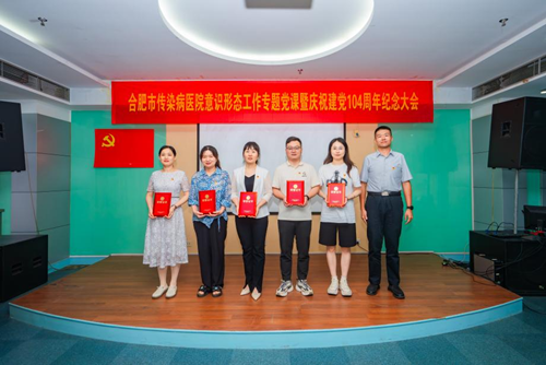 为了庆祝中国共产党成立104周年,深化党员干部意识形态教育,表彰先进典型,6月27日下午,我院在门诊部三楼会议室举行了“意识形态专题党课暨庆祝建党104周年‘七一’表彰大会”。大会由党委委员、组织人事科科长蔡晓曼同志主持,医院领导班子成员、中层干部、党员及党务干部参加会议。