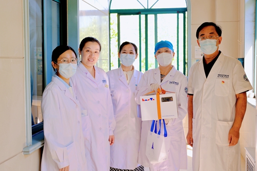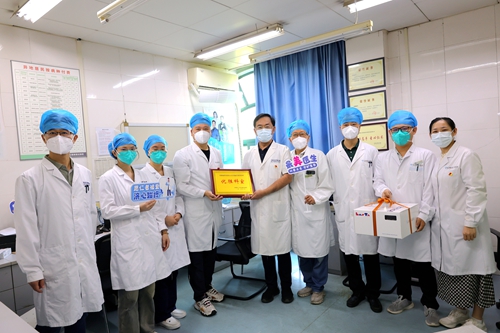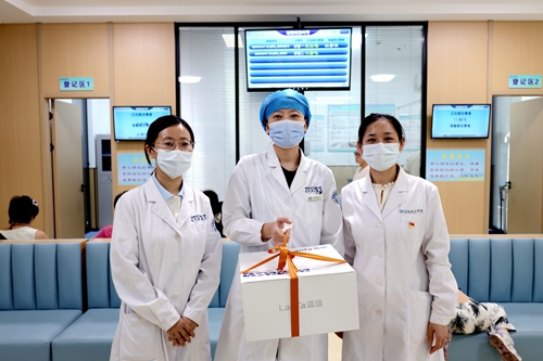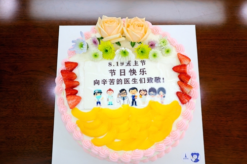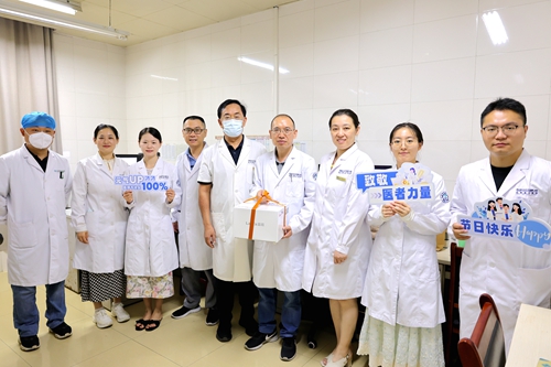 德馨于行,技精于勤。值第八个中国医师节之际,2025年8月19日上午,为弘扬崇高职业精神,彰显医者仁心风采,院党委书记张良明、党委委员戚应杰分别前往住院部和门诊部各临床医技科室,看望慰问坚守岗位、辛勤奉献的一线医务工作者,为他们送上节日蛋糕和刻有医院LOGO的蛇年医师节徽章,并向相关科室颁发医师节先进科室奖牌,致以节日的问候和诚挚的祝福。医务科科长葛静、院办公室主任杨颖等相关行政科室人员陪同慰问。