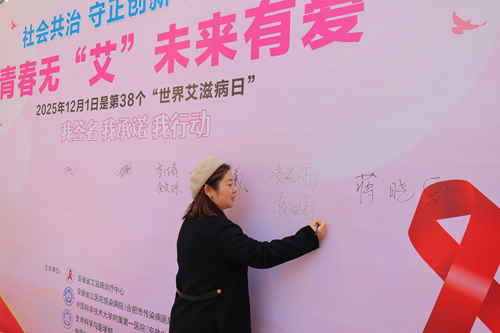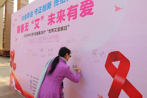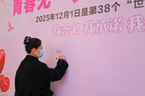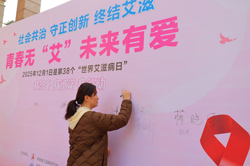 “为‘艾’发声”爱心签名墙”前温情洋溢,成为传递理性与关怀的集中地。师生们纷纷提笔,留下自己的名字和真诚寄语。“终结艾滋,需要科学与共治,也需要善意与包容”“预防艾滋病,是责任,更是对生命的尊重”——这些话语折射出师生对科学防治理念的认同;“你的价值,远超一个诊断。我们与你并肩同行”“愿善意与你常伴,前路有光,生命无畏”——一句句温暖的鼓励,寄托着对艾滋病感染者的尊重、支持与美好祝福。签名墙渐渐被真挚的文字填满,凝聚成一股强大的校园暖流。