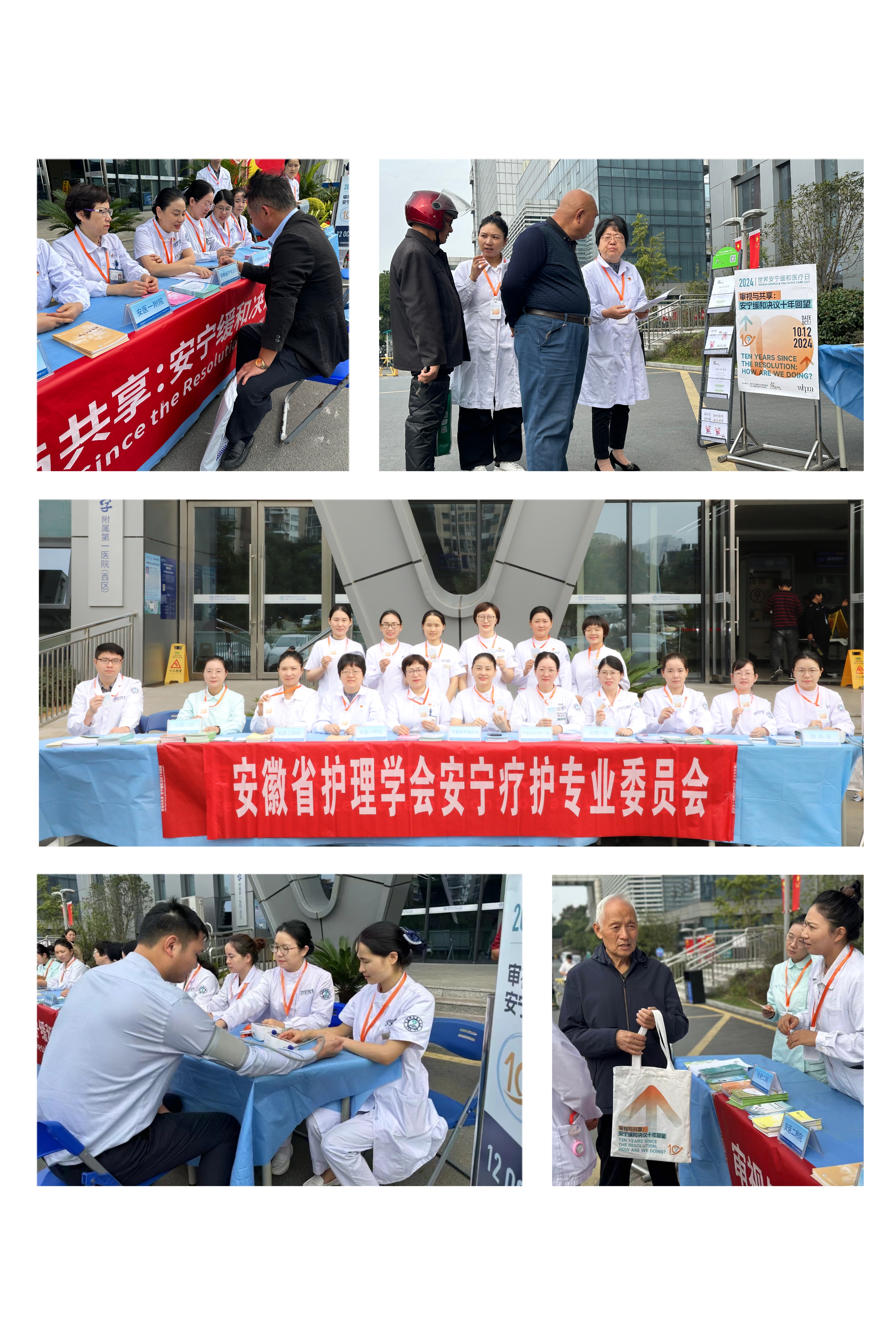 安宁缓和科普宣传活动于10月12日8:00-9:00在安徽省肿瘤医院2号楼门口开展。本次活动由安徽省护理学会安宁疗护专业委员会策划,安徽省肿瘤医院、中国科学技术大学附属第一医院、安徽医科大学第一附属医院、安徽医科大学第二附属医院、安徽中医药大学第一附属院、合肥市第一人民医院、合肥市第二人民医院等委员单位参加。专委会主任委员胡成文,副主任委员李彩云、杜华、朱小明及安宁疗护护理人员共20余人参与此次活动。大家为患者和家属讲解“世界安宁缓和医疗日”设立的背景及意义;宣讲“我的五个愿望”,发放“2024缓和医疗日”资料袋;围绕安宁缓和议题进行解惑、讨论、分享;进行多学科咨询、监测血压、现场答疑;对公众开展生命教育,启发生命思考,受到患者和家属的一致好评。