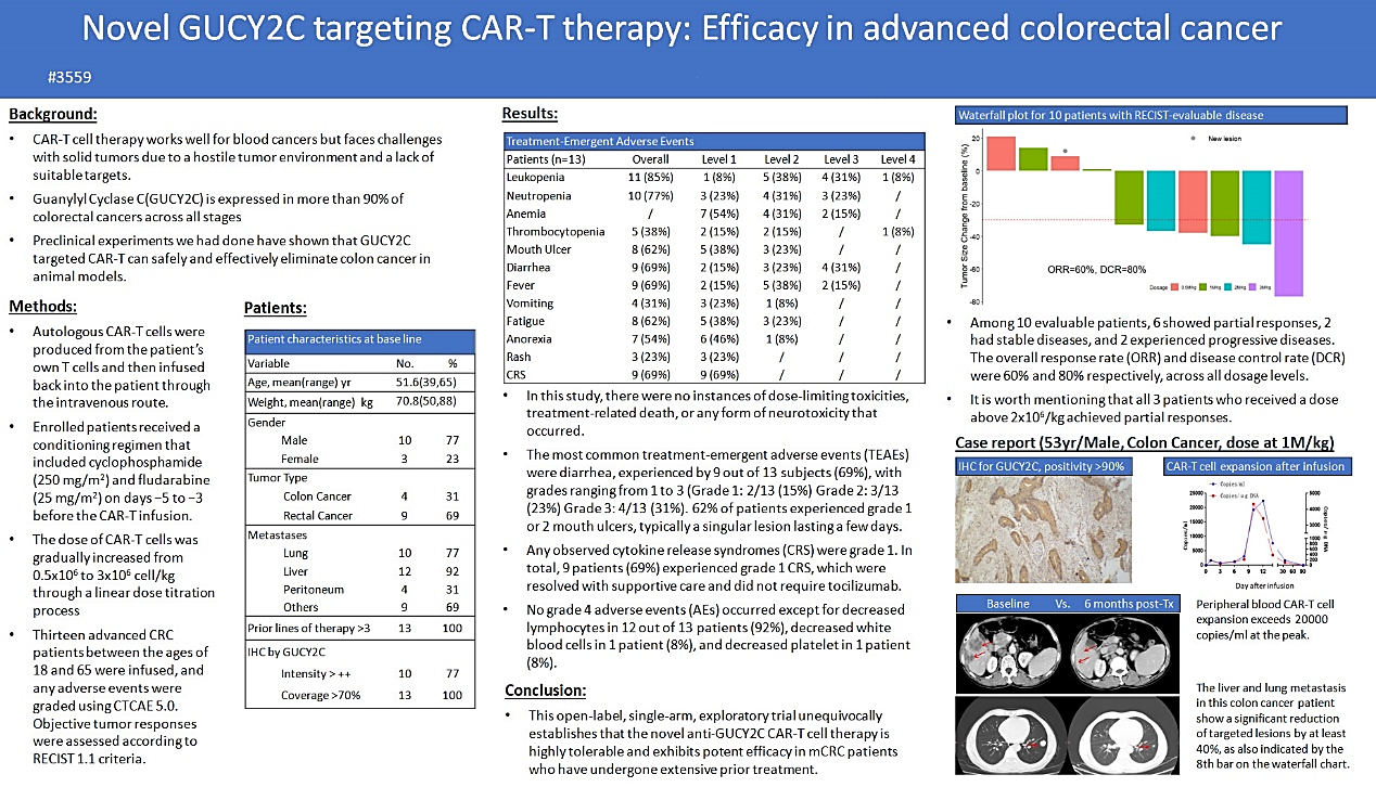 北京时间2023年5月26日,由我院生物治疗科(肿瘤内科五病区)牵头发起的CAR-T细胞治疗晚期结直肠癌临床研究摘要在2023 ASCO(美国临床肿瘤学会)年会上公布(如下图1)。
