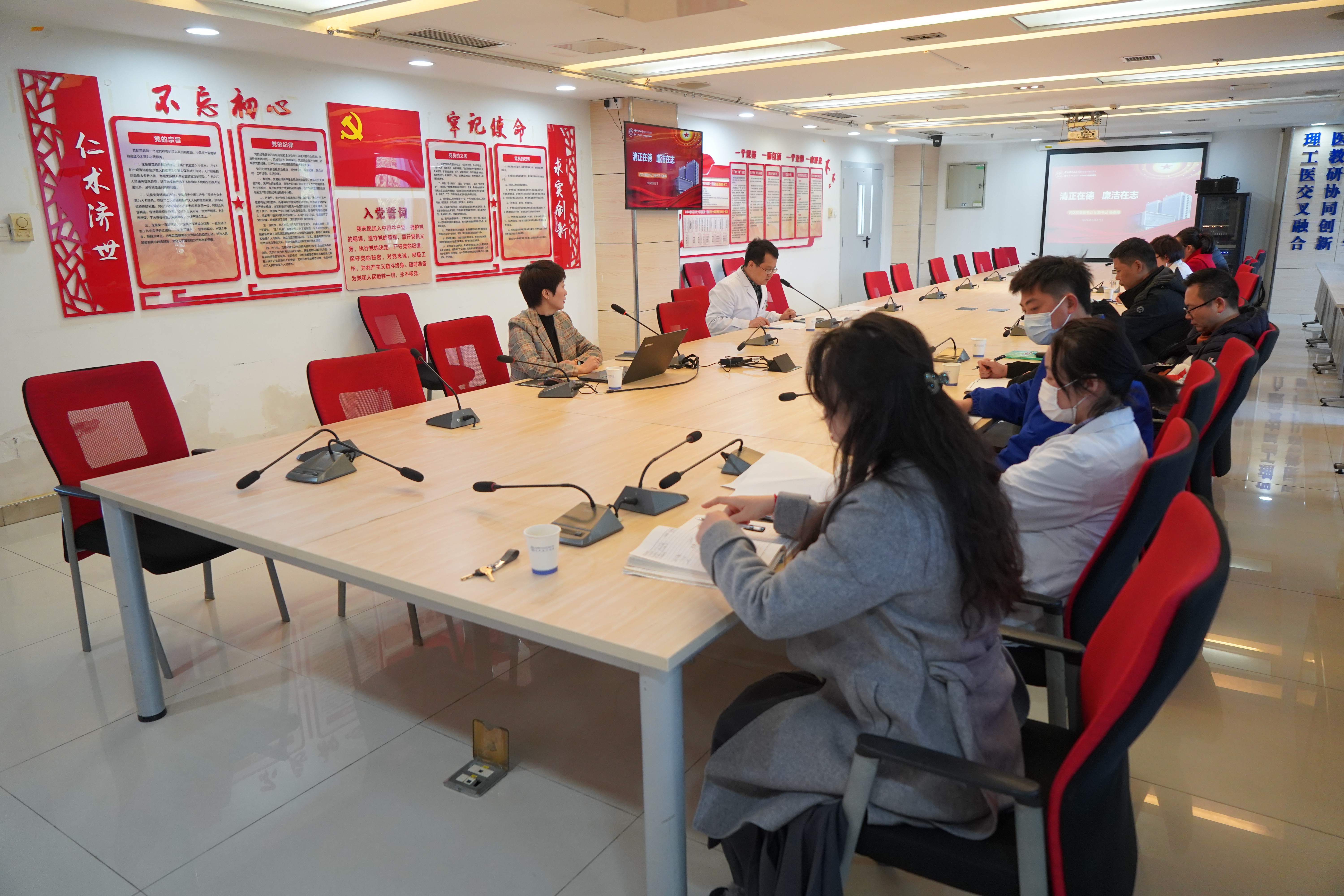 杨春梅书记首先以“知敬畏、守底线、存戒惧、做表率”为思想主线,做出了围绕清醒认识医疗行业反腐倡廉形式、严格遵守党纪法规行业行规、践行医工工作者使命担当等方面的具体工作贯彻执行要求,系统学习了国家层面、医疗行业层面、全省卫生纪检系统层面的政策要求和相关工作会议精神。随后,针对主旨要义、贯彻执行和修订内容等方面,详细阐述了《条例》的精神实质和具体规定并对非党员的政务处分依据:《事业单位工作人员处分规定》作了深入分析。同时,以反面典型案例为镜鉴,理论结合实际,深入浅出地展示了违法违纪行为与后果。杨书记对全体医工同事提出要求,希望以案为戒,时刻保持清醒头脑,抵制不良诱惑,自觉做到在政治上清醒坚定,作风上清正廉洁,扣好廉洁从业的“每一粒扣子”。