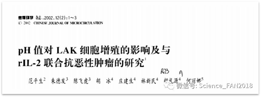 2002年9月,国内外首次研究发现,恶性实体肿瘤酸性状态明显降低了LAK细胞、rIL-2的抗肿瘤作用;影响了细胞与细胞之间的“接触”:在倒置显微镜下观察到激活的LAK细胞与人肝癌细胞7404玫瑰花结形成;pH值为7.3时LAK细胞+ rIL-2结数是pH值6.8时的7倍,是pH值为7.6的2倍多,说明过酸、过碱不利于LAK细胞与人肝癌细胞7404的接触。pH值6.8和pH值7.6组LAK细胞生长有显著差异性,pH值从6.8提高到7.6有利于LAK细胞增殖。《pH值对LAK细胞增殖的影响及与rIL-2联合抗恶性肿瘤的研究》这一文章于2001年12月06日《微循环学》杂志收稿,2002年12月接受发表。