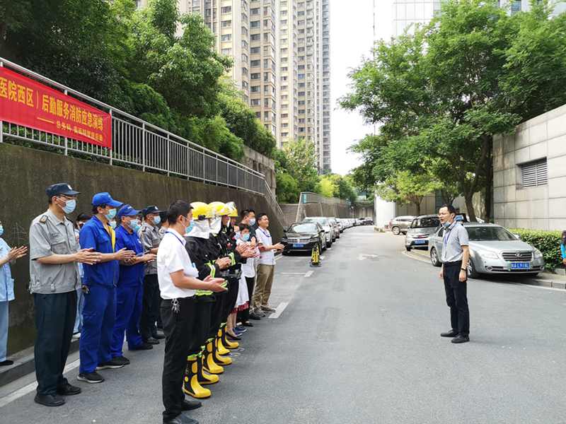 消防控制中心查明火情后立即拨打119,同时向医院保卫科长报告。接着通知和秩序维护部部长和受理部告知各部门组织人员增援,机电部负责切断着火房间电源,并做好一切必要的后勤保障工作。消控室人员适时启动行政楼二层讯响器、消防广播,利用监控实时查看现场情况,依据实情决定是否启动消防水泵、喷淋泵等。秩序维护部集结消防应急小组,3分钟内赶到起火地点,打开消火栓,取出水带、水枪,连接,进行灭火,形成第二灭火力量。疏导组则引导科室及其他现场人员进行安全疏散,在疏导员的引导下参与,用湿毛巾掩住口、鼻,低姿、鱼贯而行。演练过程紧张有序,从火灾报警到预案启动,再到人员疏散,整个演练过程仅仅用了不到10分钟,最终演练圆满结束。