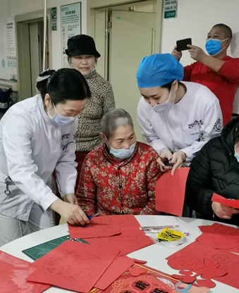 科主任刘云琴、护士长朱小明、钱翠英和科室的医务人员们、病友及家属积极参加活动,不一会大大的圆桌已围满了。圆桌上放满了各色各样的剪纸福字及老虎的图案,节日氛围非常浓烈。刘主任为本次活动做了简要开场致辞,她对所有病人和家属的参与,表示了感谢和欢迎,鼓励每一个病友都有战胜疾病的信心,并祝福大家在新的一年身体健康,我们放疗病区越来越好。刘主任话音刚落,大家就自发响起热烈的掌声,所有的病人被深深的感染着。接下来就是我们的剪纸活动,我们在各式各样的福字和小虎图案中选出自己喜欢的样式,在医务人员的悉心指导下,广大的病友同志们一点就透,大家就这样坐下来,心静下来,手头忙起来,边聊着边做着,纷纷剪出喜庆的图案。所有人脸上都洋溢着幸福的笑容,这一下午,大家忘却了所有的烦恼,战胜了身体的不适,这一下午,我们都是普通的迎接传统新年到来的国人。最后,大家一起拍照留念。