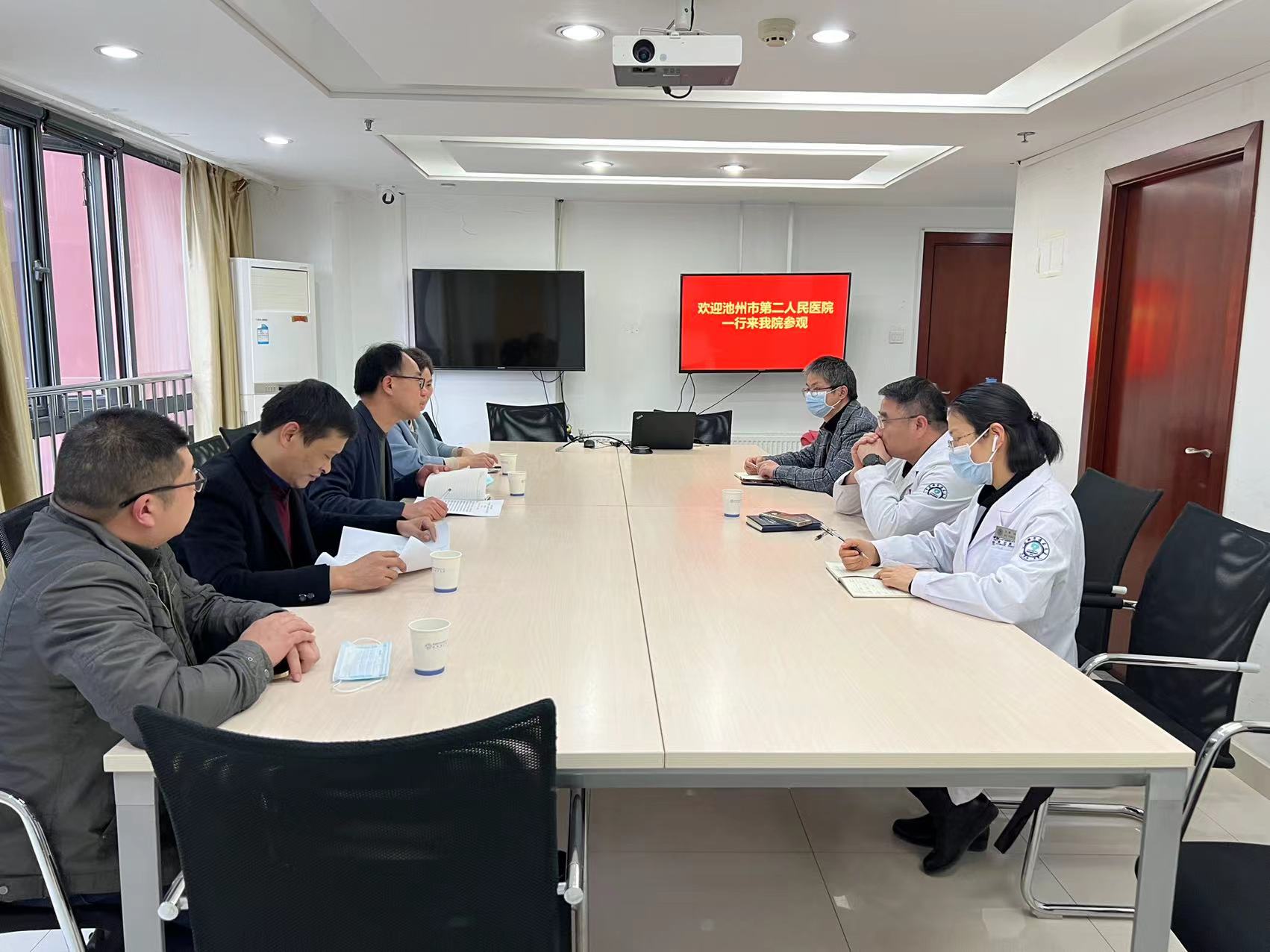 医务科主任张洪波,综合办主任肖剑,门诊部主任王静及相关工作人员参会。会上,张洪波主任对朱主任一行的到来表示热烈欢迎,双方简要介绍了各自医院建设等方面的成效。