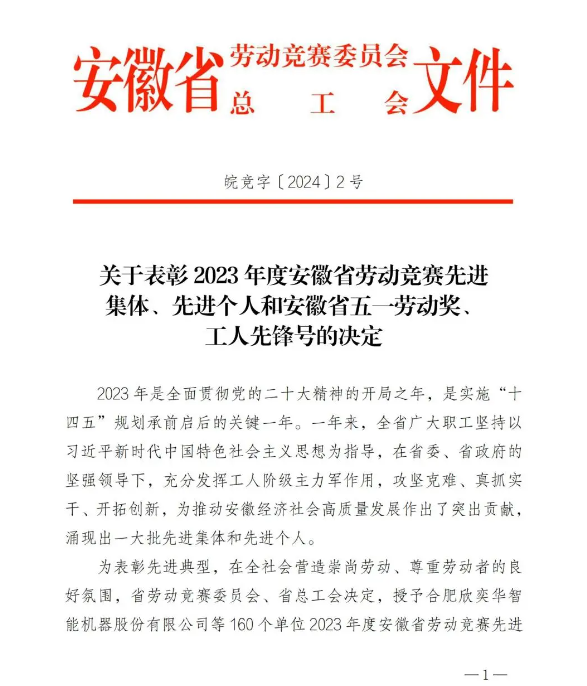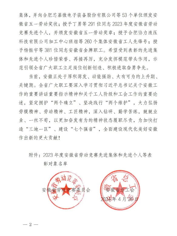 为表彰先进典型,在全社会营造崇尚劳动、尊重劳动者的良好氛围,近日,省劳动竞赛委员会、省总工会联合下发了《关于表彰 2023 年度安徽省劳动竞赛先进集体、先进个人和安徽省五一劳动奖、工人先锋号的决定》。