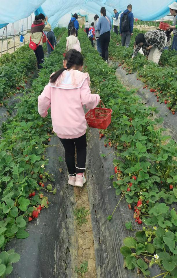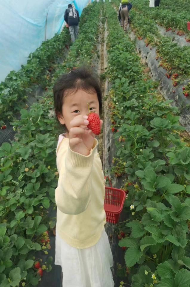 上午9点10分,大家集合出发,第一站来到了长丰草莓园,草莓园四周的空地上开满了油菜花,在太阳的映照下发出耀眼的光芒,大地上还开着许多说不上名来的小野花,小朋友们迫不及待地闻闻、摸摸,和同伴、父母交流着自己的发现,大声喊着“春天真美!”,不一会儿春天就被他们天真烂漫的笑容填满。进入草莓大棚,草莓株一排排的,上面挂满了大大小小的草莓,孩子们兴奋极了,每人手上拎着一个红色的小蓝子,迫不及待的进行了草莓选拔,选到自己喜欢的赶紧摘下来,捏在小手里给爸爸妈妈看自己摘的草莓有多漂亮。爸爸妈妈们竖起大拇指直夸赞“宝贝摘的这颗草莓一看就很甜”,幸福的画面一幕又一幕。
