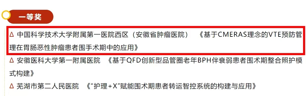 该项目聚焦于胃肠恶性肿瘤患者围术期VTE高风险,融合中西医理念,基于循证制定并实施了VTE最佳管理方案,包括AI智能辅助决策、优化管理流程、强化中西医干预措施等,显著降低了VTE发生率,在所有项目中脱颖而出,选题、内容、创新性和选手表现等受到专家评委一致好评,最终以总分第一荣获安徽省护理品质改善项目一等奖。