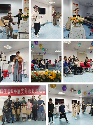 祖国征程风华露,百代复兴绘蓝图。在举国共庆党的二十大胜利召开之际,为展现手麻工会和手麻支部的精神风貌,加强工会和支部文化建设,增强大家庭的凝聚力和创造力,在西区分工会王凤霞主席和手麻支部书记陈兰仁主任的大力支持下,2022年11月6日下午,在做好疫情防控工作的基础上,一场以“医路韶华,声生不息”为主题的手麻科室工会首届联欢系列活动之秋日欢唱会在麻醉示教室悄然举行。本次欢唱会一共征集了12个表演曲目,由麻醉科肖艺敏医生和手术室魏春苗护士长共同策划,手术室孙怡然担任主持,工会孙妍老师作为特邀嘉宾亲临现场并参加演出。原本静悄悄的会议室不时传来阵阵欢声笑语,冰冷的墙面被五彩的气球装扮的焕然一新,一派喜气洋洋的景象。
