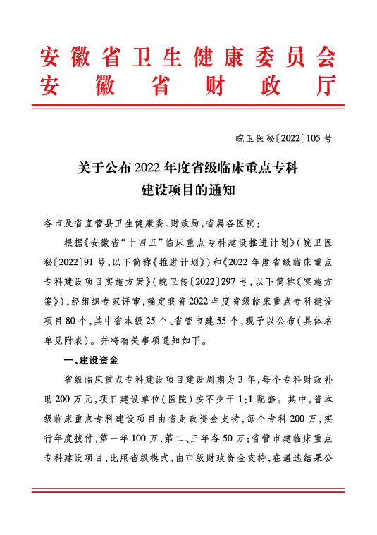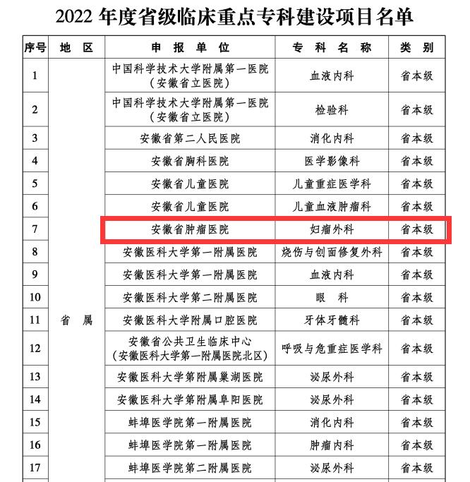 9月23日,安徽省卫健委和安徽省财政厅联合公布了关于2022年度省级临床重点专科建设项目遴选评审结果(皖卫医秘[2022]105号)。经专家组评审,我院妇瘤外科获批2022年度省级临床重点专科。