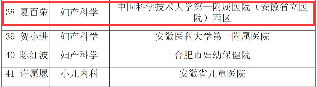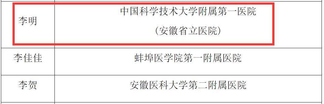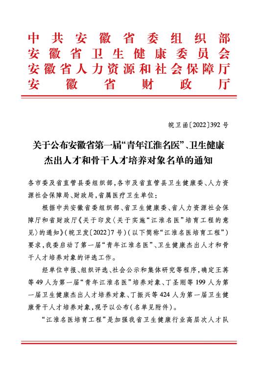 按照省卫健委《关于开展第一届安徽省卫生健康骨干人才、杰出人才“青年江淮名医”选拔工作的通知》文件精神,我院组织开展安徽省卫生健康委首批青年人才及青年江淮名医选拔申报推荐工作。全院共有6人获批人才称号,其中 1名专家(夏百荣)获评青年江淮名医,1名专家(高劲)获批杰出人才,4名青年人才(李明、韦超、臧春宝、张扬)获得第一届安徽省卫生健康骨干人才称号。